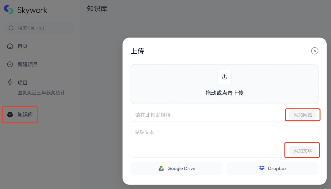 为了解决这些挑战,Skywork 上线了个人知识库。我们可以上传 pdf、doc、ppt、xls 等多种格式的文件,也可以上传录音、url 和 youtube 视频播放地址。每个知识库支持上传最多 50 个文档,并可根据不同主题创建多个知识库,实现清晰有序的知识管理。