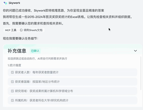 Skywork 并不急于执行,而是通过与用户交互确认任务细节,包括统计维度(如获奖人数、国籍、研究领域、所属机构)和展示方式(如表格、趋势图、占比图等)。这种前置的任务拆解能力,使得整个分析过程具有极高的准确性和可控性。