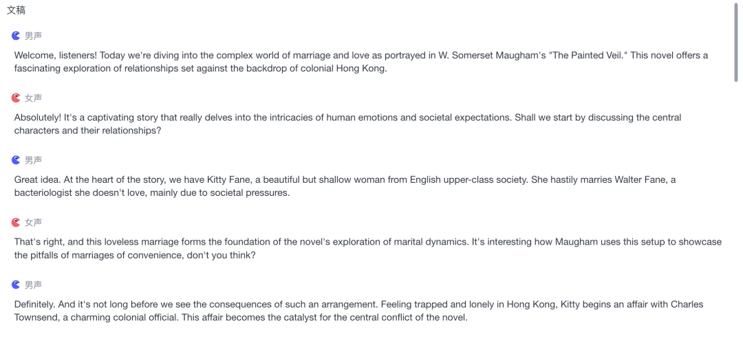 AI 男女主播吐字清晰,语音语调自然真实,语气词、说话的气口都把握得相当到位。从内容来看,他俩也不是照本宣科,而是在真正读懂了小说后,针对播客这一媒介形式进行的自我创作。