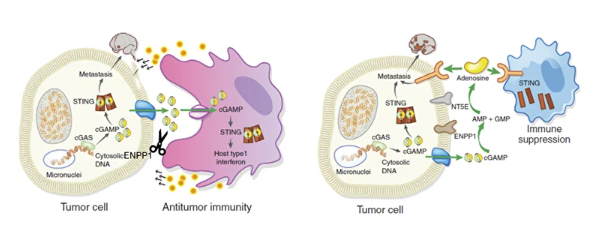 已有研究发现,ENPP1抑制剂可以通过调节胞外cGAMP的浓度激活cGAS-STING通路。研究团队推测,通过抑制ENPP1,从而阻断cGAMP的降解,可增加肿瘤组织内cGAMP的积累,为激活cGAS-STING通路、增强宿主抗肿瘤免疫效应提供一种有前景的策略。