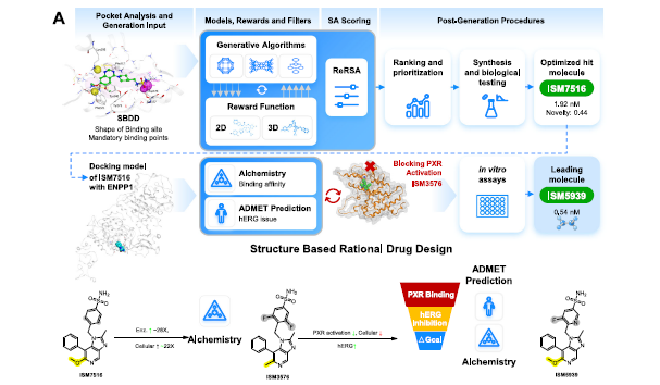 在进一步的分子优化阶段,团队进一步结合Chemistry42旗下的结合能计算模块Alchemistry及ADMET特性预测模块等多项功能,优先筛选结合自由能更低、hERG毒性较小、ENPP1抑制能力更强的候选分子。经过多轮优化和迭代,最终筛选出成药性优异的候选化合物ISM5939,展现出理想的ENPP1抑制选择性和高效力。