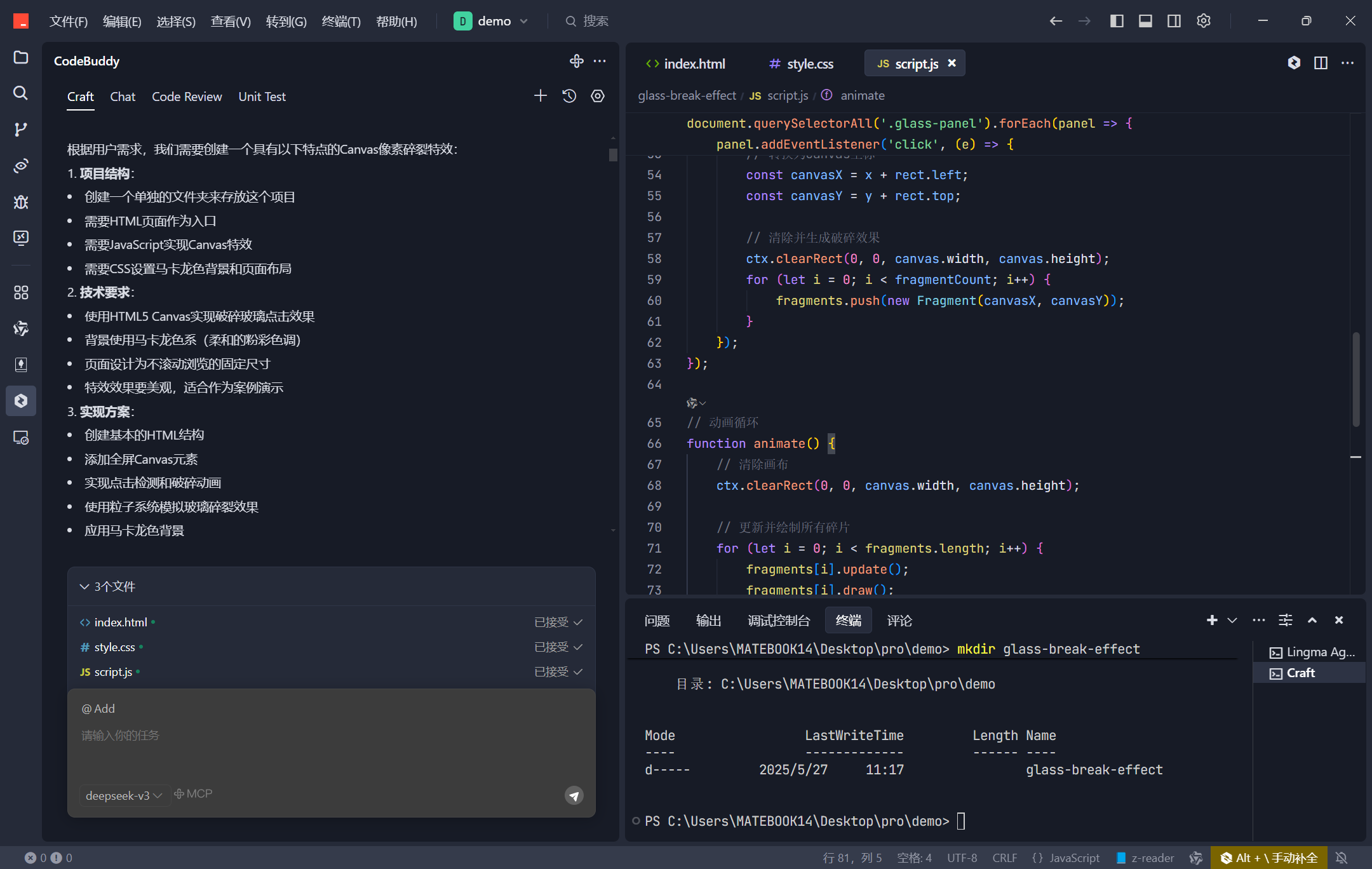 在一个项目中,我需要为网页添加一个玻璃破碎的动画效果,以增强用户的交互体验。然而,实现这样一个复杂的动画效果并非易事,需要考虑到物理模拟、图形绘制等多个方面的知识。面对这个挑战,我决定借助AI的力量来完成这个任务。