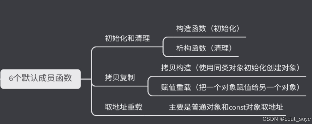 C++ 编译器会为每个类自动生成以下6个默认成员函数(除非显式定义)。如果用户没有定义这些函数,编译器会生成默认实现: