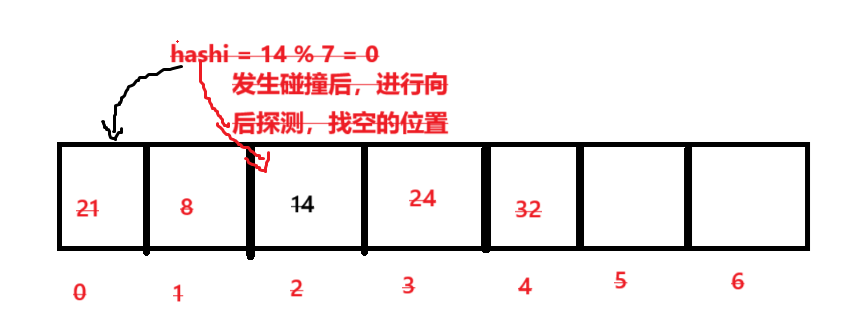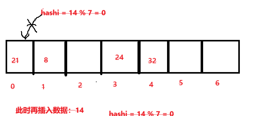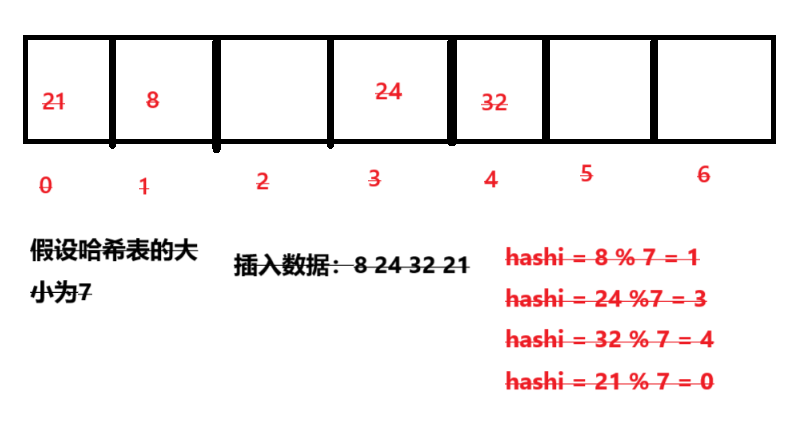 哈希值 是 键值 通过 哈希函数 计算得出的位置标识符,一个位置标识难以不被多个数据映射。 下面以示例来展示哈希冲突过程: 插入数据:8 24 32 21后的哈希表