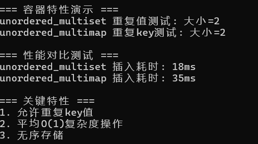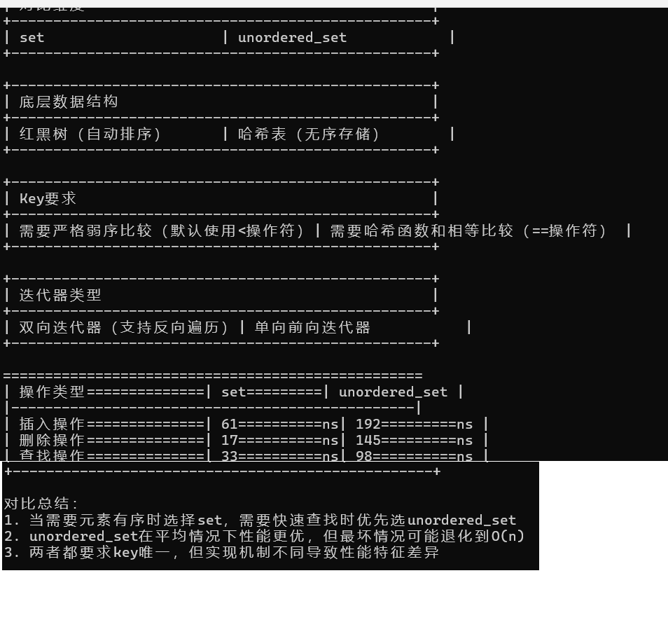 << "2. unordered_set在平均情况下性能更优,但最坏情况可能退化到O(n)\n"