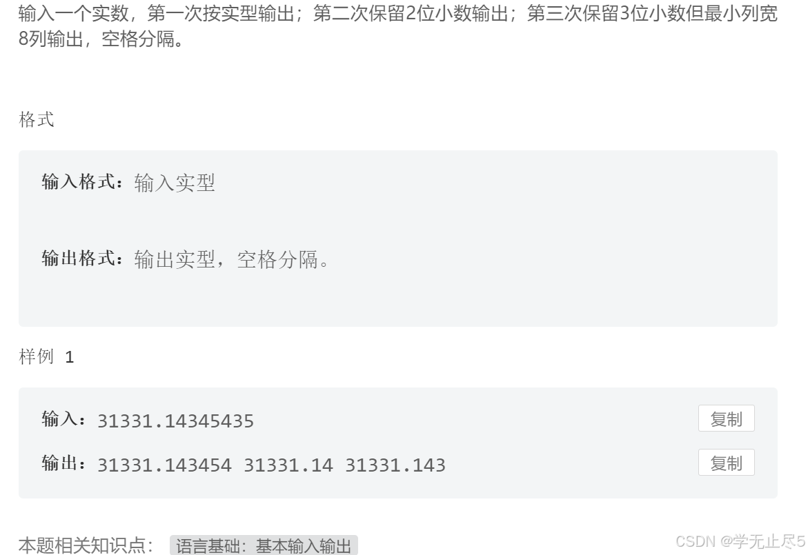 输入一个实数,第一次按实型输出;第二次保留2位小数输出;第三次保留3位小数但最小列宽8列输出,空格分隔。