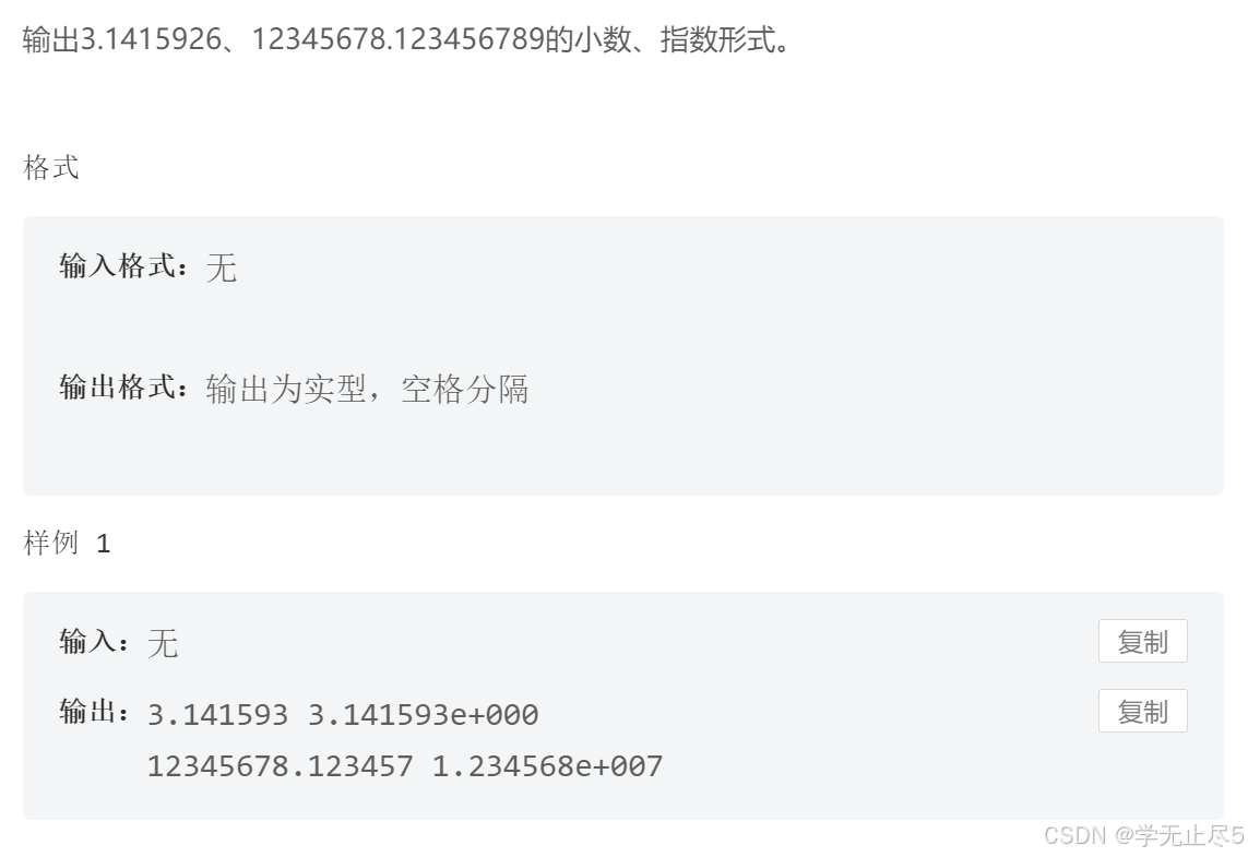 }输出3.1415926、12345678.123456789的小数、指数形式。