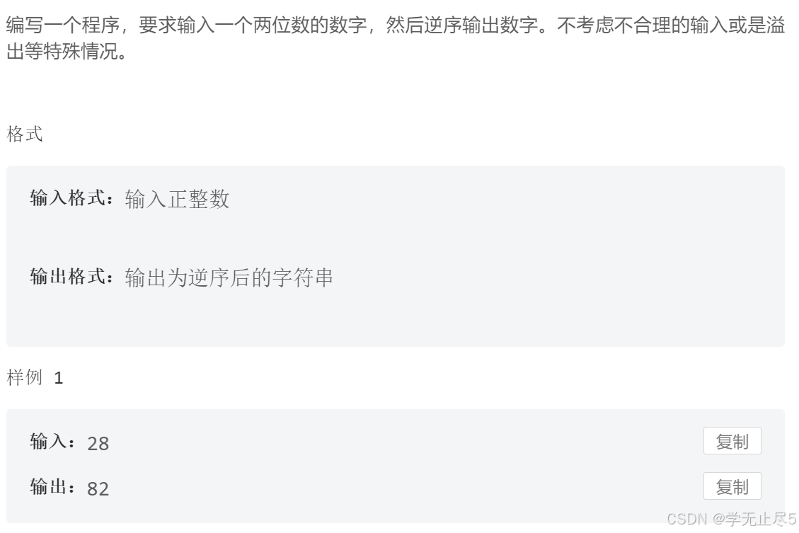 }编写一个程序,要求输入一个两位数的数字,然后逆序输出数字。不考虑不合理的输入或是溢出等特殊情况。