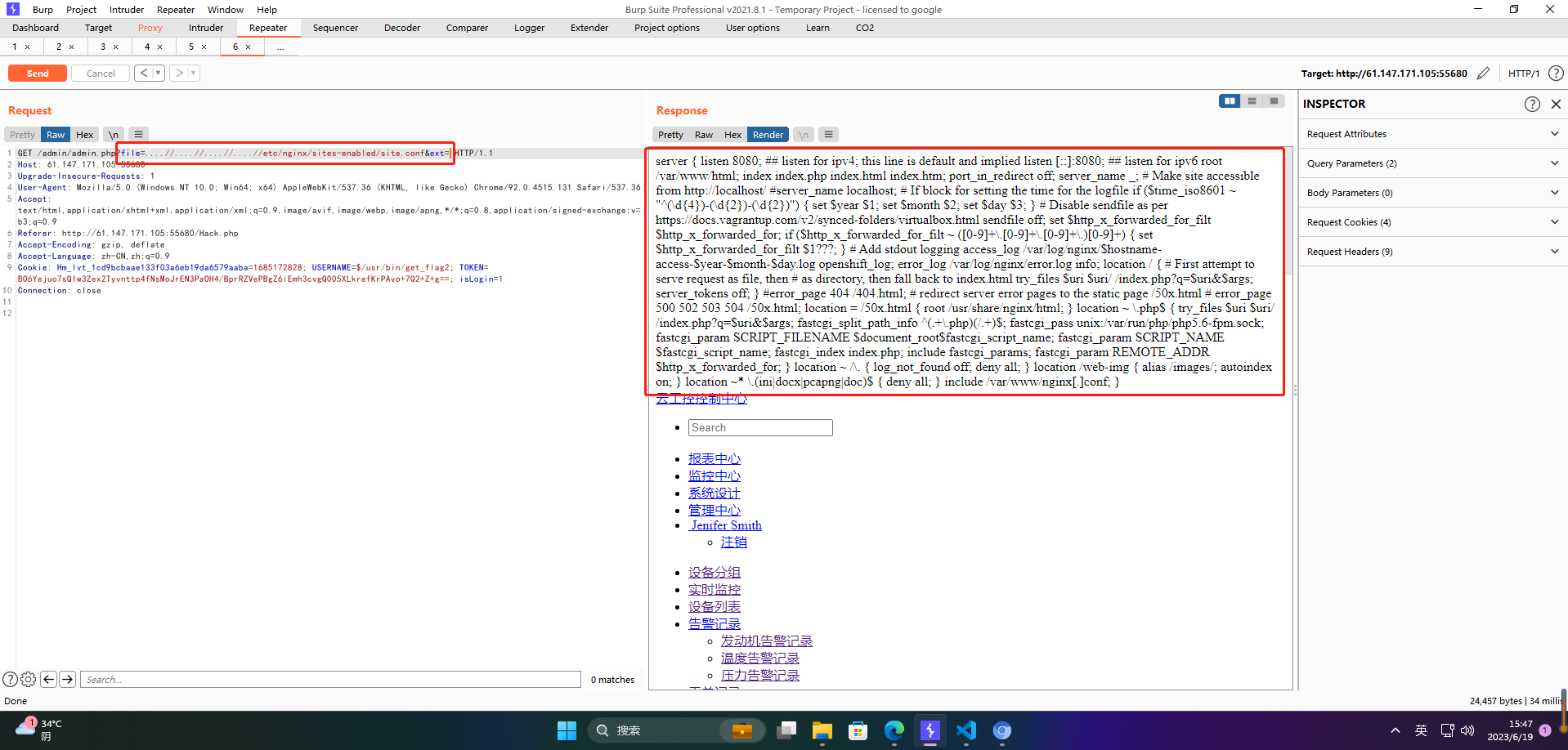 发现url中file=index&ext=php,不妨测试一下…/,发现这里过滤了…/:根据hint.php可以知道配置文件的路径,那就构造payload:file=....//....//....//....//etc/nginx/sites-enabled/site.conf&ext=