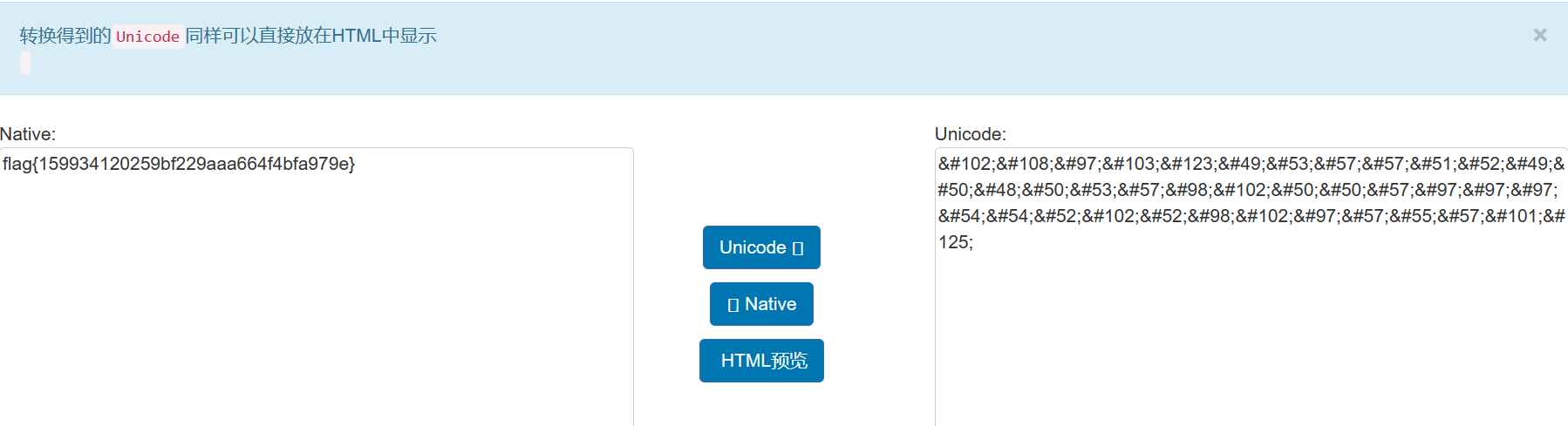 flag{159934120259bf229aaa664f4bfa979e}使用Unicode编译成ASCII码就可以得到flag