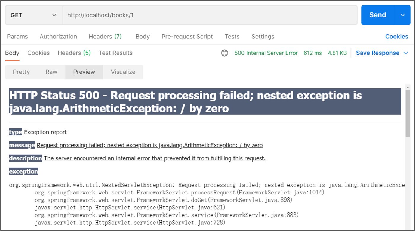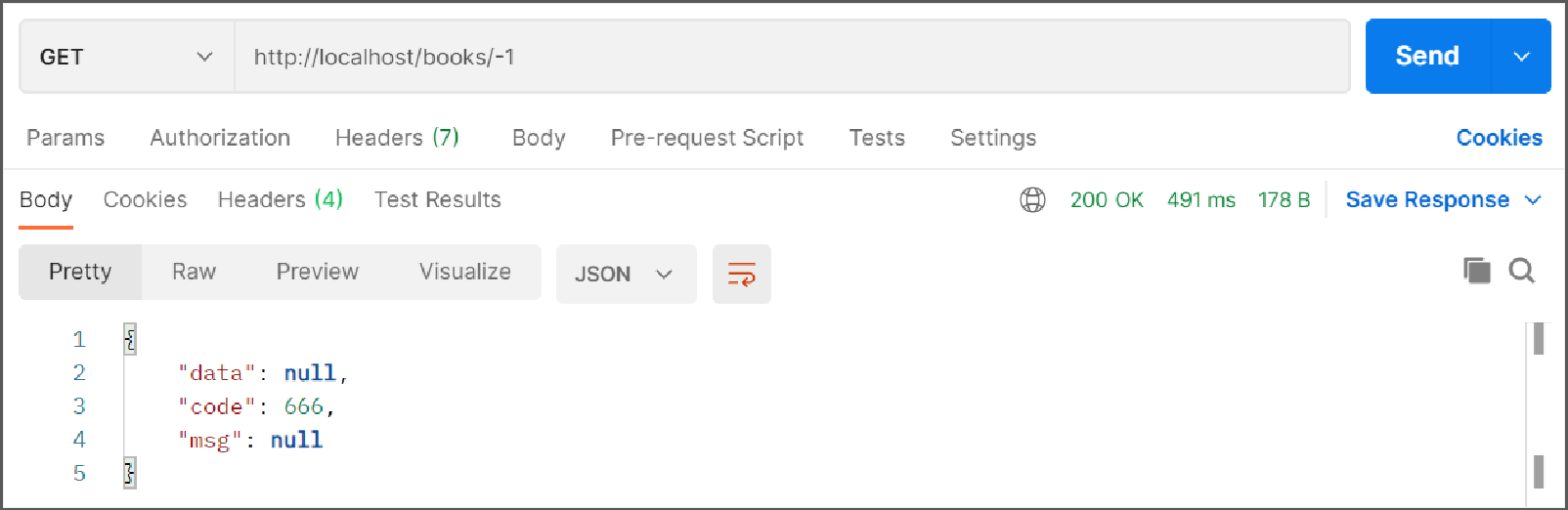测试:在postman中发送请求访问getById方法,传递参数-1,得到以下结果: