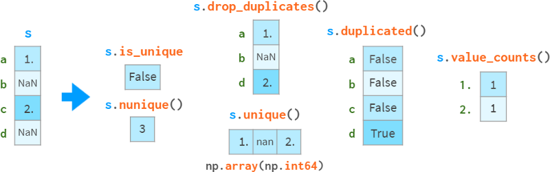 如果你想排除nan,需要显式地这样做。在这个例子中,是s.l opdropna().is_unique == True。