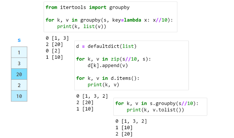 在上面的例子中,输入数据是有序的。groupby不需要这样做。实际上,如果分组中的元素不是连续存储的,它也同样有效,因此它更接近于collections.defaultdict,而不是itertools.groupby。它总是返回一个没有重复项的索引。