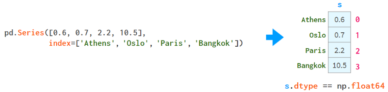 使用方括号而不是圆括号的目的是为了访问Python的切片约定:你可以使用单个或双冒号,其含义是熟悉的start:stop:step。像往常一样,缺少开始(结束)意味着从序列的开始(到结束)。step参数允许使用s.iloc[::2]引用偶数行,并使用s[‘Paris’:‘Oslo’:-1]以相反的顺序获取元素。