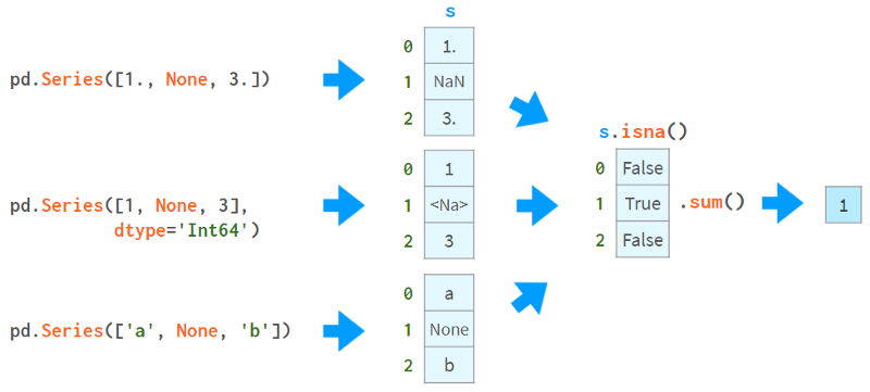 Pandas开发人员特别关注缺失值。通常,你通过向read_csv提供一个标志来接收一个带有NaNs的dataframe。否则,可以在构造函数或赋值运算符中使用None(尽管不同数据类型的实现略有不同,但它仍然有效)。这张图片有助于解释这个概念: