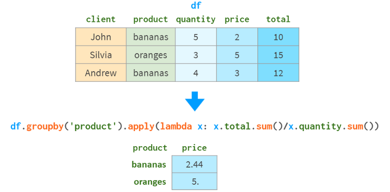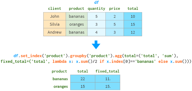 不幸的是,你不能把预定义的聚合和几个列级的自定义函数结合在一起,比如上面的那个,因为agg只接受单列级的用户函数。单列范围的用户函数唯一可以访问的是索引,这在某些情况下很方便。例如,那天香蕉以5折的价格出售,如下图所示: