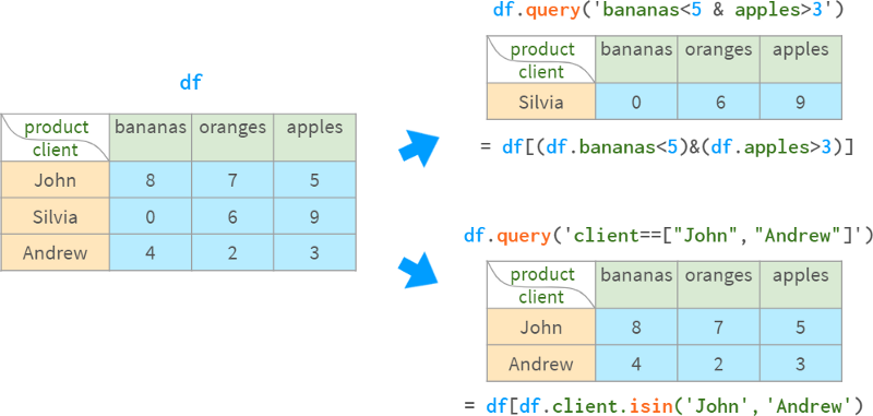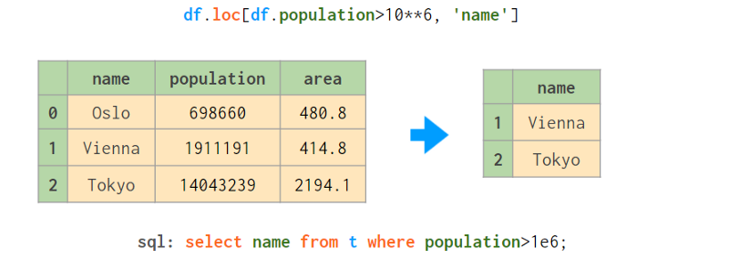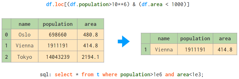df.query(‘population>1e6 and area<1000’)它们更短,适合多索引,并且逻辑操作符优先于比较操作符(=需要更少的括号),但它们只能按行过滤,并且不能通过它们修改Dataframe。
