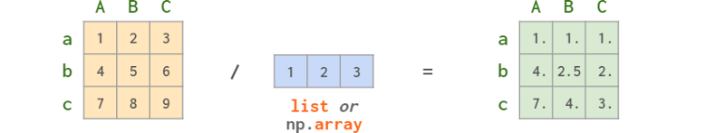 因此,在不太幸运(也是最常见的!)的情况下,将一个dataframe除以列向量序列,你必须使用方法而不是操作符,如下所示: