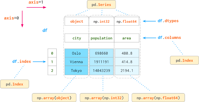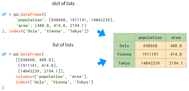在第一种情况下,在没有行标签的情况下,Pandas用连续的整数标记行。在第二种情况下,它对行和列都进行了相同的操作。为Pandas提供列的名称总是一个好主意,而不是整数标签(使用columns参数),有时也可以提供行(使用index参数,尽管rows听起来可能更直观)。这张图片会有帮助: