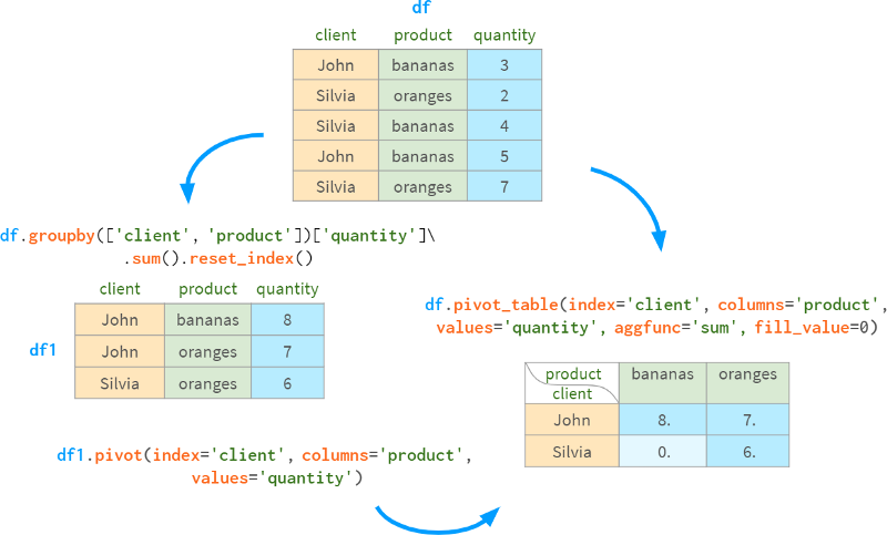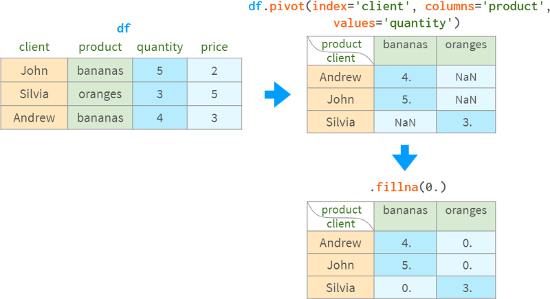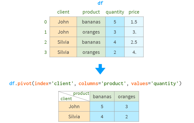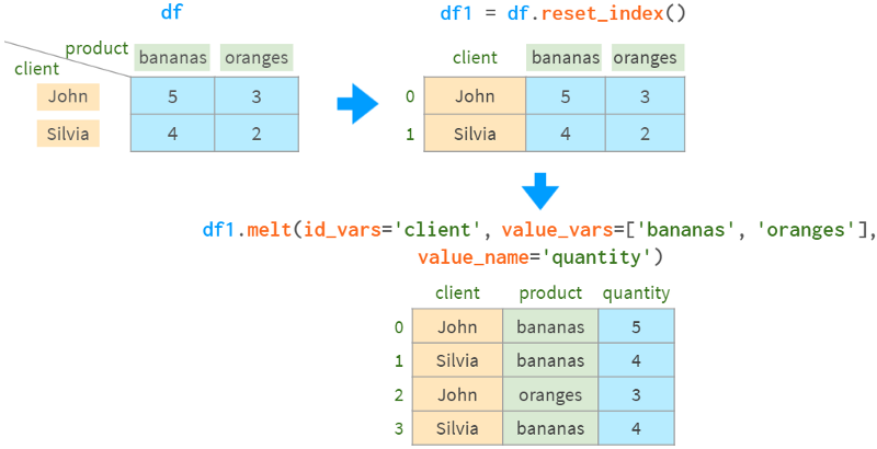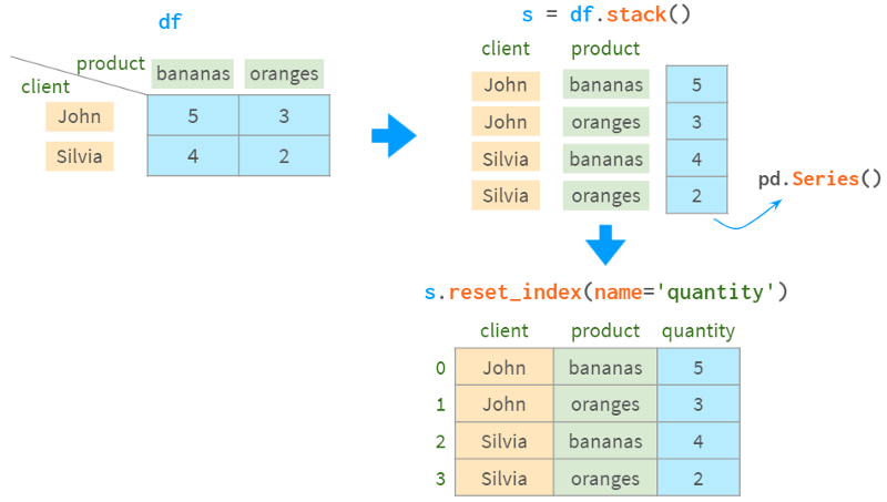 该命令丢弃了与操作无关的任何信息(索引、价格),并将来自三个请求列的信息转换为长格式,将客户名称放入结果的索引中,将产品名称放入列中,将销售数量放入DataFrame的body