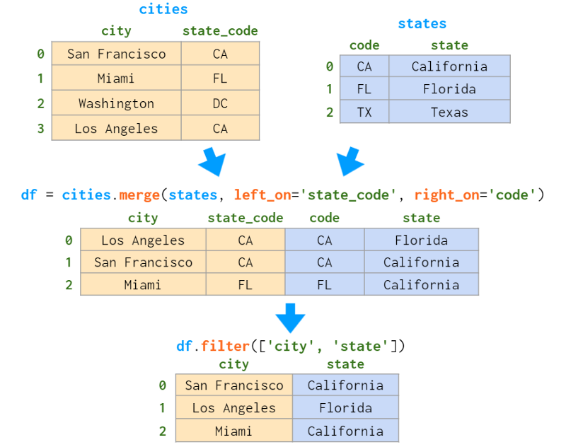 从这个简化的例子中可以看出(参见上面的全外连接),与关系型数据库相比,Pandas对行顺序的处理相当轻松。左外联结和右外联结比内外联结更容易预测(至少在需要合并的列中有重复值之前是这样)。因此,如果你想保证行顺序,就必须显式地对结果进行排序。