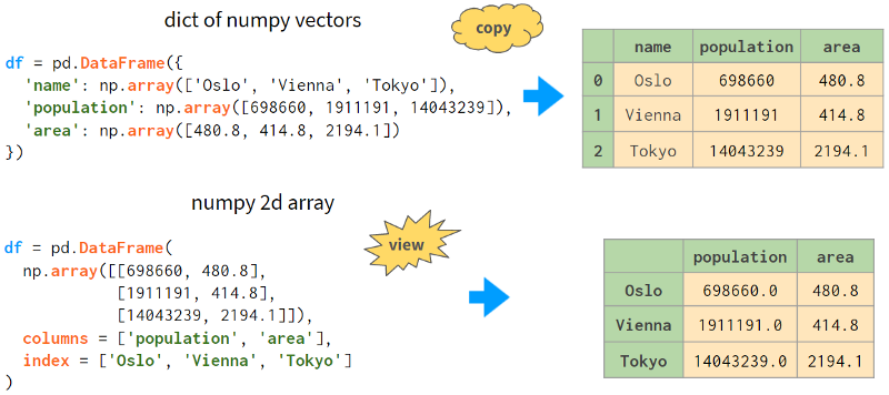 请注意,在第二种情况下,人口数量的值被转换为浮点数。实际上,它在之前的构建NumPy数组时就发生过。这里需要注意的另一件事是,从2D NumPy数组构建dataframe默认是视图。这意味着改变原始数组中的值会改变dataframe,反之亦然。另外,它节省了内存。
