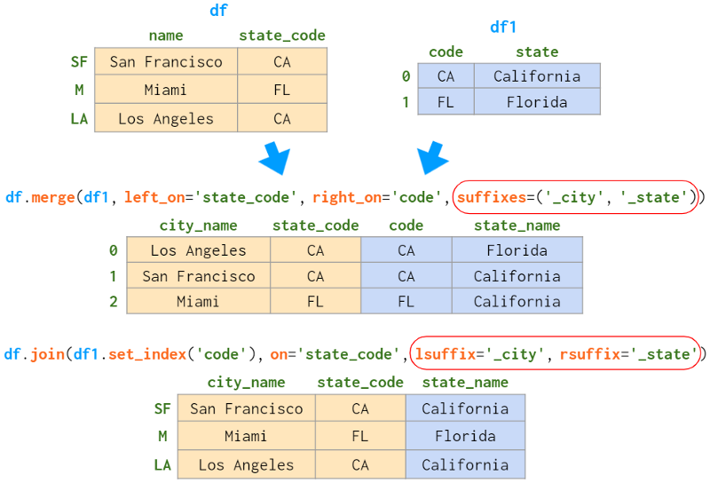 有时,合并的dataframe具有同名的列。merge和join都有解决二义性的方法,但语法略有不同(默认情况下merge会用_x