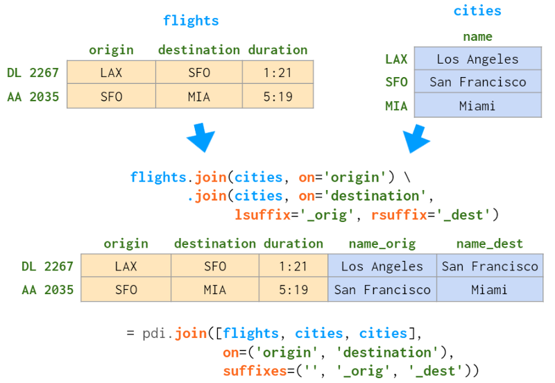 pdi.join是Join的一个简单包装器,它接受on、how和后缀参数,以便您可以在一个命令中进行多个联结。与原始的关联操作一样,关联的是属于第一个DataFrame的列,其他DataFrame根据它们的索引进行关联操作。