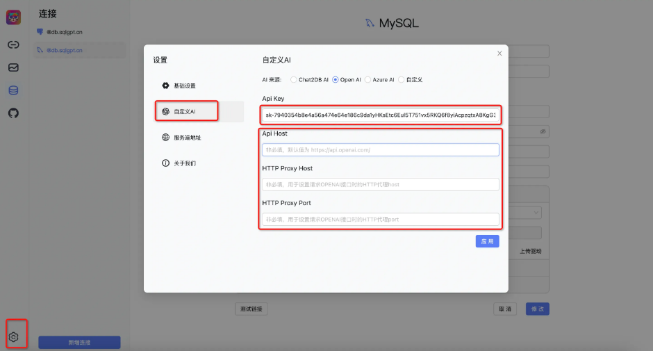 点击左下角设置–》自定义AI–>OpenAI,输入Open AI Key,点击保存即可。Api Host 一般不需要修改,如果你有私有部署的 OpenAI 代理,可以修改 Api Host。HTTP Proxy Host、HTTP Proxy Port 一般不需要填,如果你的网络需要代理才能访问 OpenAI,可以配置代理。