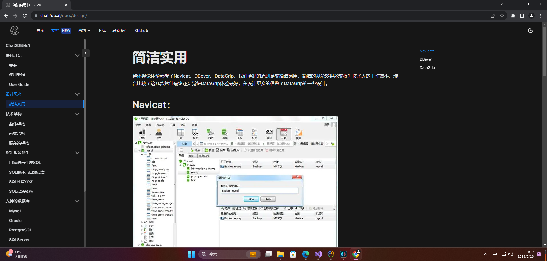 和传统的数据库客户端软件Navicat、DBeaver 相比Chat2DB集成了AIGC的能力,能够将自然语言转换为SQL, 也可以将SQL转换为自然语言,可以给出研发人员SQL的优化建议,极大的提升人员的效率,是AI时代数据库研发人员的利器, 不懂SQL的运营或业务也可以轻松使用快速查询业务数据、生成报表的能力。