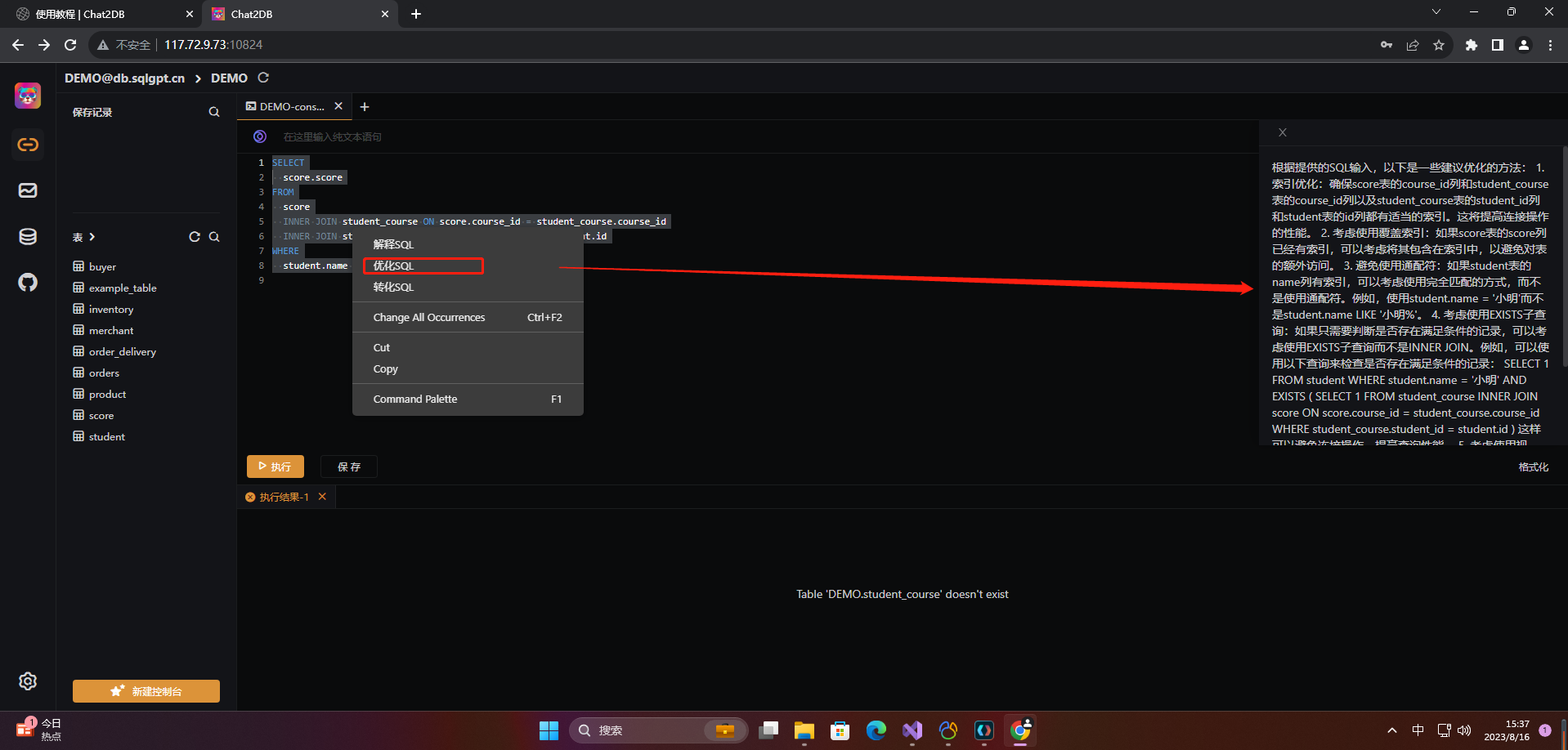 选中 SQL 右键 优化SQL,在右侧弹窗中 AI 即可对 SQL 生成建议。