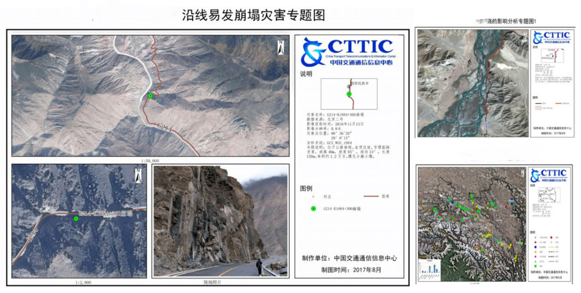 道路灾害监测与应急救援。利用卫星遥感、航空摄影、无人机和北斗定位导航技术、地面监测等多种手段,对道路周边环境的地质、地貌条件进行调查,监测和评估潜在风险,并针对重点目标如灾害多发区、典型边坡桥梁等进行日常业务化监测,形成相应专题产品,实现对重要交通基础设施的形变监测。