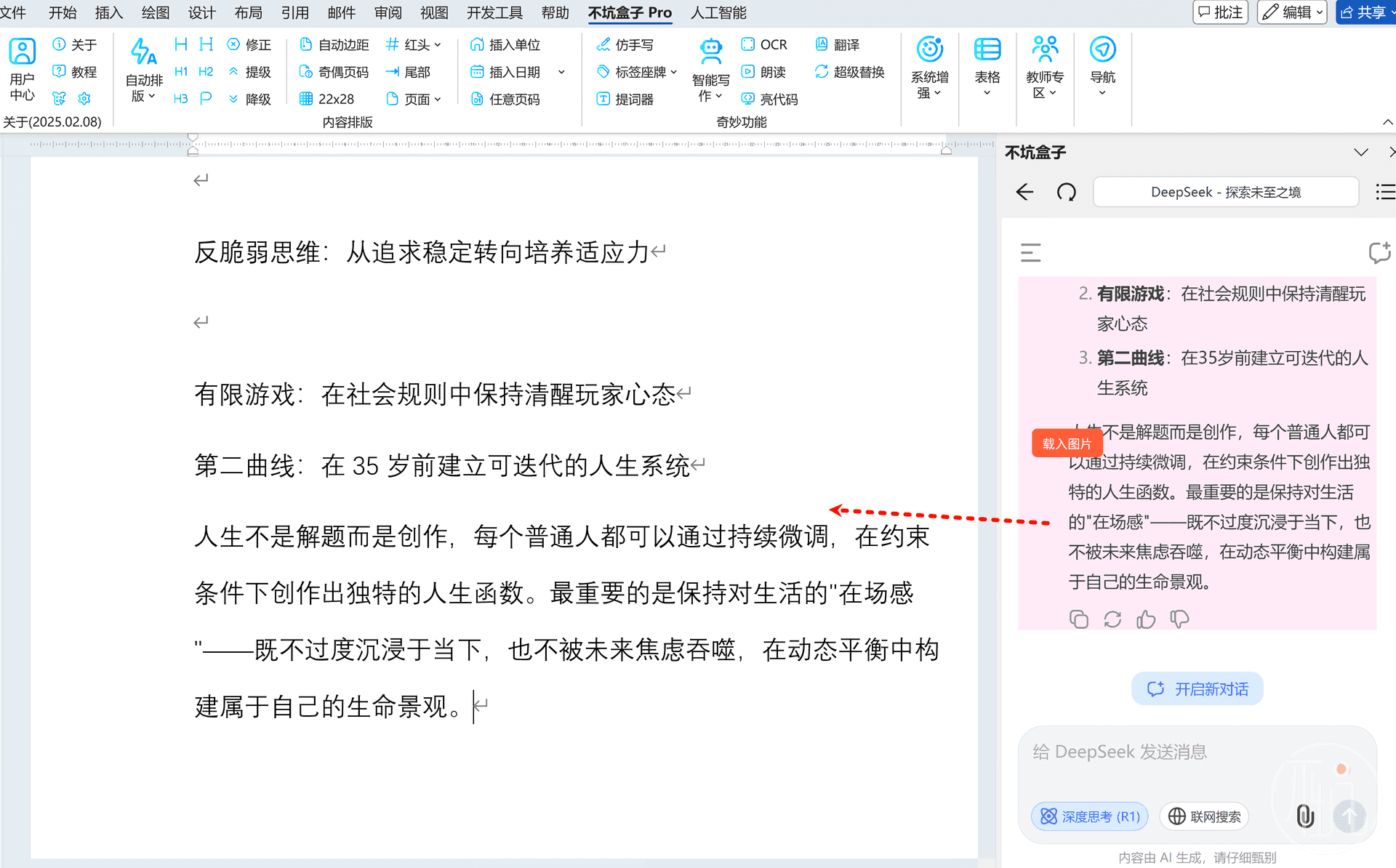 这个时候,不坑盒子的灵感之窗的作用就体现出来了,何止是DeepSeek-R1,你可以在右侧打开任意AI官网,写作好内容后一键载入到Word之中。