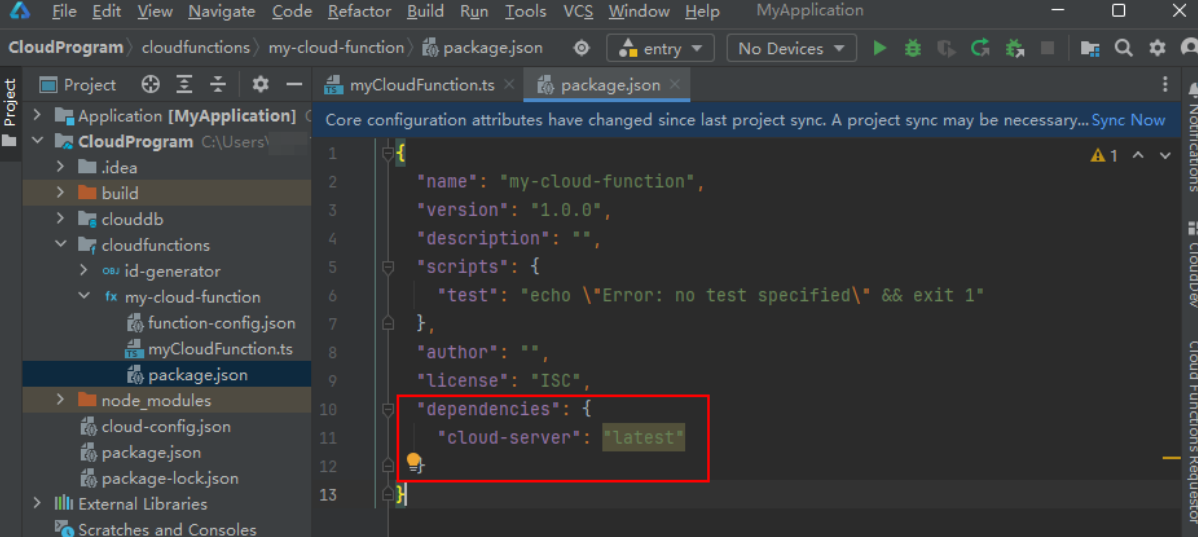 2. (可选)如函数存在依赖关系,可在“package.json”文件的“dependencies”下添加需要的依赖,然后点击右上角“Sync Now”。
