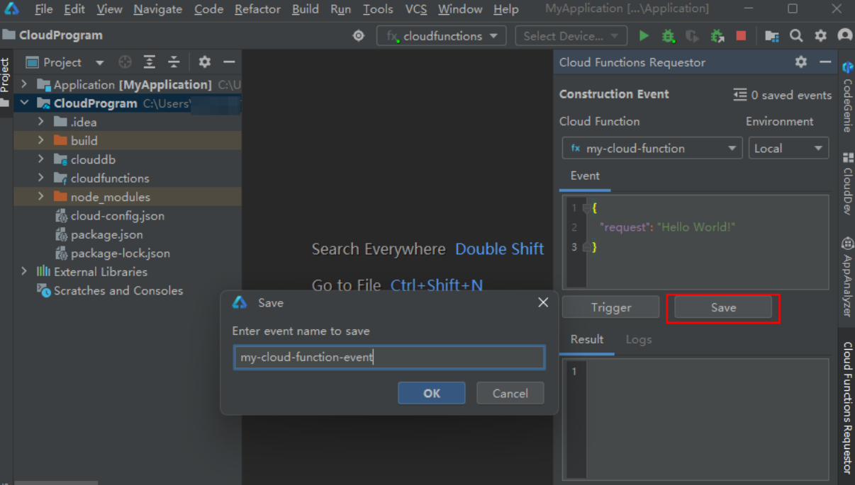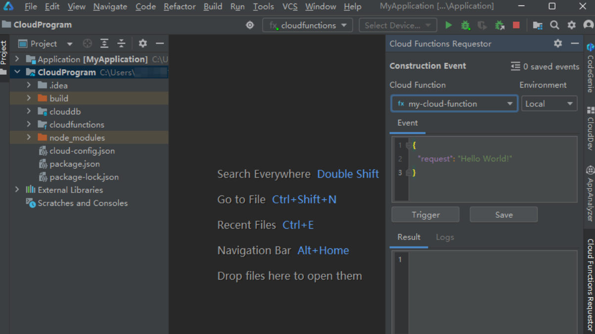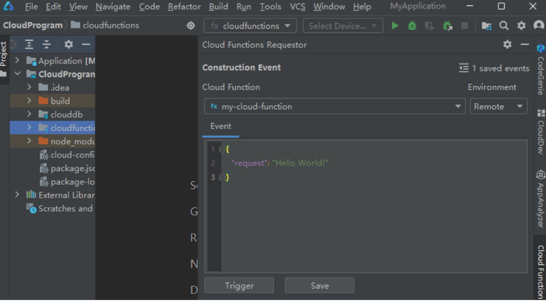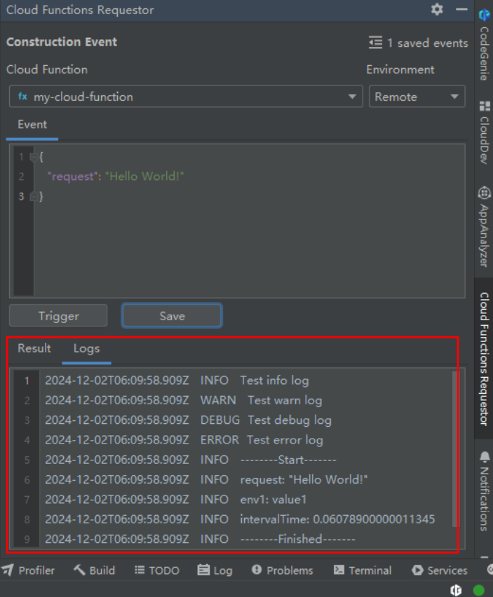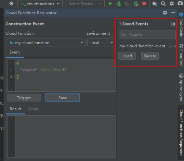 4. 在菜单栏选择“View > Tool Windows > Cloud Functions Requestor”,使用事件模拟器(Cloud Functions Requestor)触发函数调用。