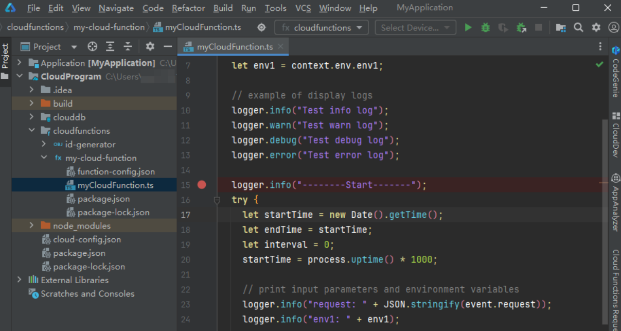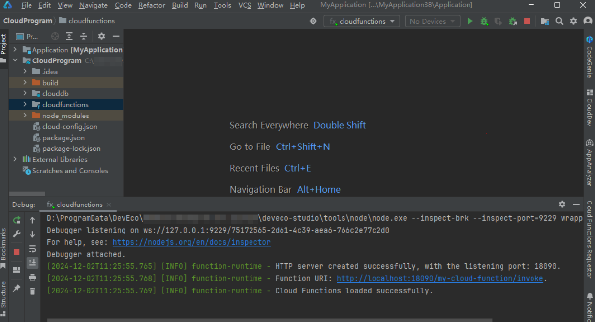 下文以Debug模式下调试单个函数“my-cloud-function”为例,介绍如何在DevEco Studio调试本地函数。