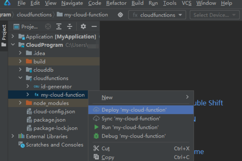 1. 右击“my-cloud-function”函数目录,选择“Deploy 'my-cloud-function'”。