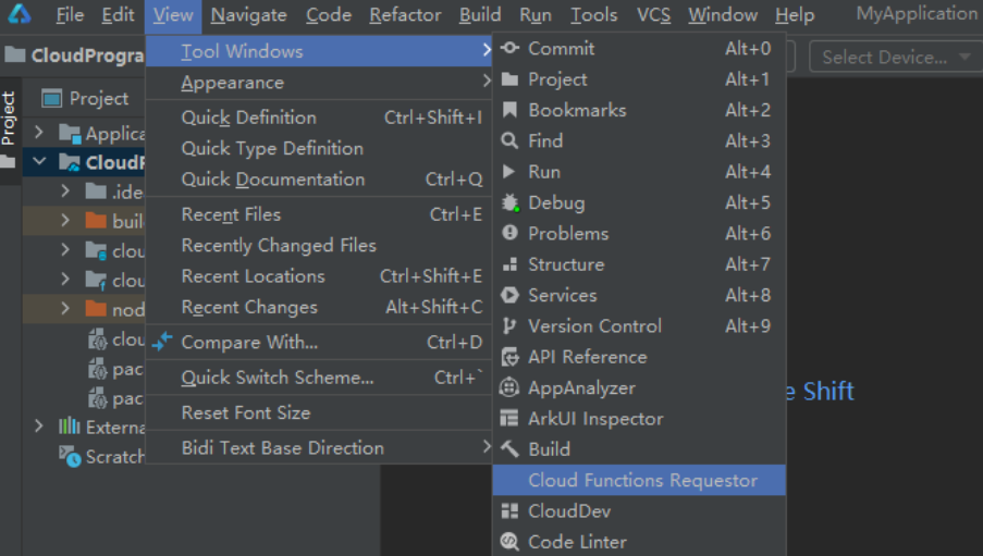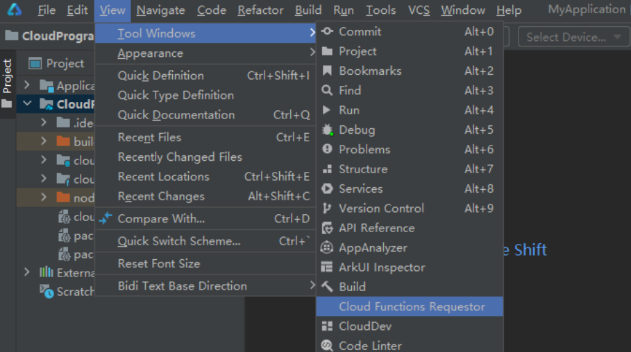 3. 在菜单栏选择“View > Tool Windows > Cloud Functions Requestor”,使用事件模拟器(Cloud Functions Requestor)触发函数调用。