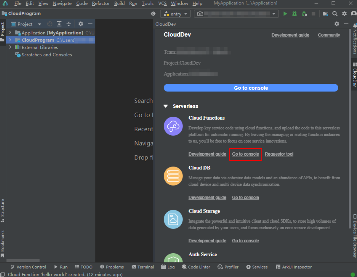 4. 在打开的CloudDev面板中,点击“Serverless > Cloud Functions”下的“Go to console”,进入当前项目的云函数服务页面。