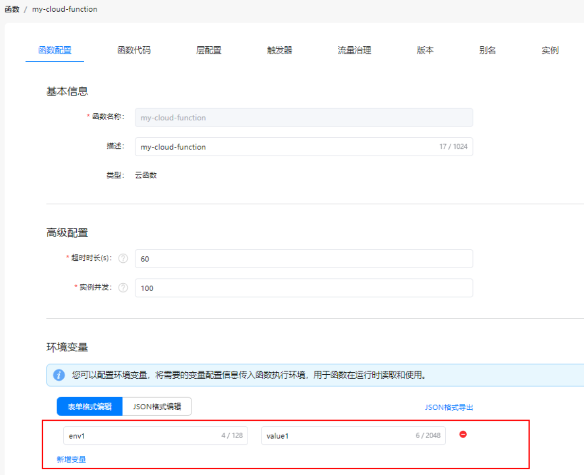 logger.info(context.env.name);//name为环境变量名称如下图,函数“my-cloud-function”配置了环境变量“env1”,可成功访问环境变量“env1”的值“value1”。