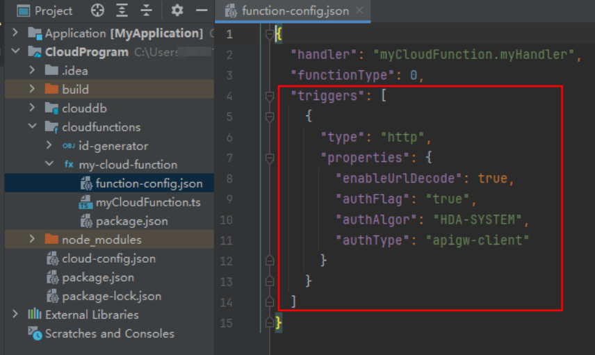 云函数当前仅支持HTTP触发器, “function-config.json”文件中已为您自动完成HTTP触发器配置。配置了HTTP触发器的函数被部署到云端后,您的应用即可通过Cloud Foundation Kit调用函数。