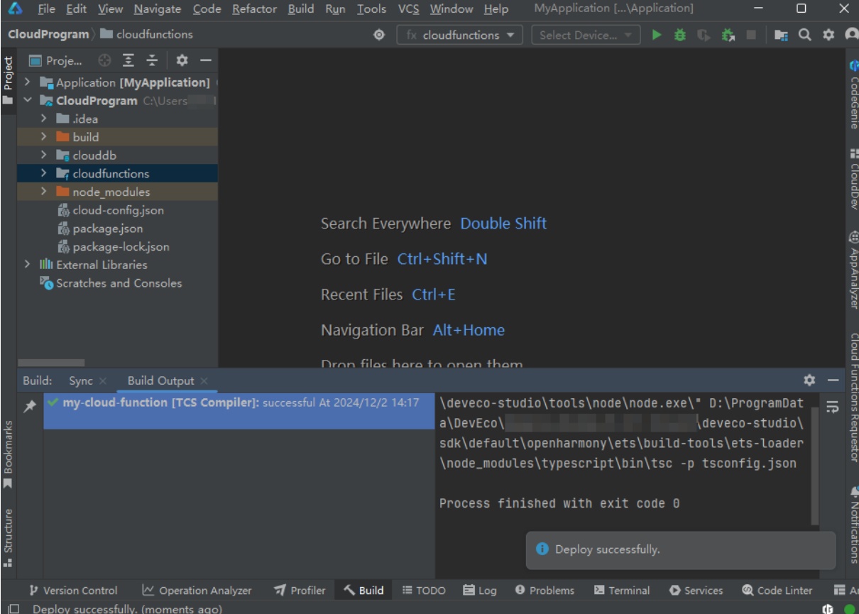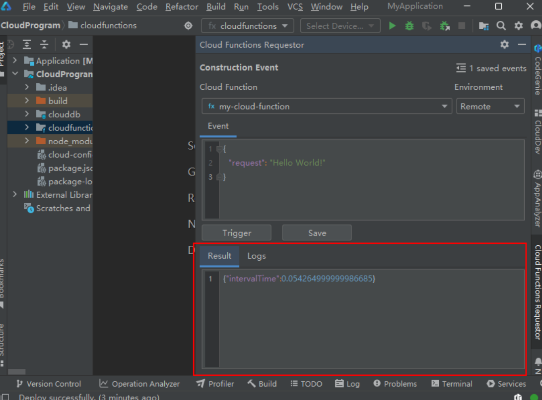 还可以将函数部署至AGC云端,然后在DevEco Studio调用云端函数,以测试函数在云端的运行情况、或补充测试因各种因素限制未能在本地调试中发现的问题。