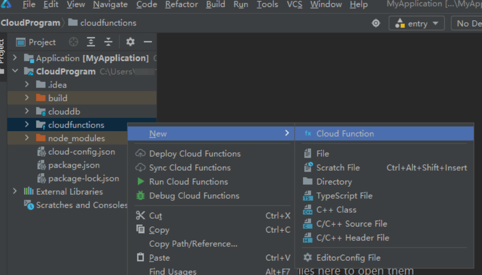 1. 右击“cloudfunctions”目录,选择“New > Cloud Function”。