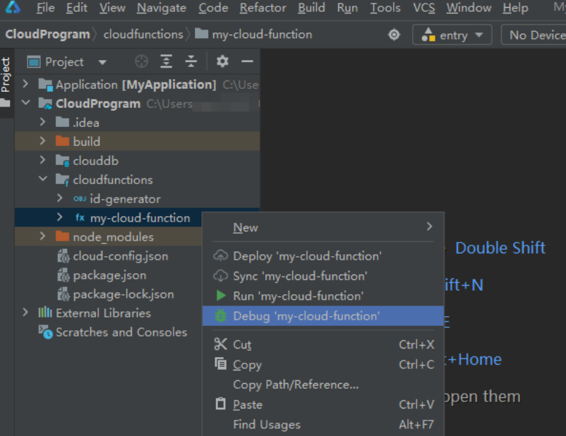 1. 右击“my-cloud-function”函数目录,选择“Debug 'my-cloud-function'”。