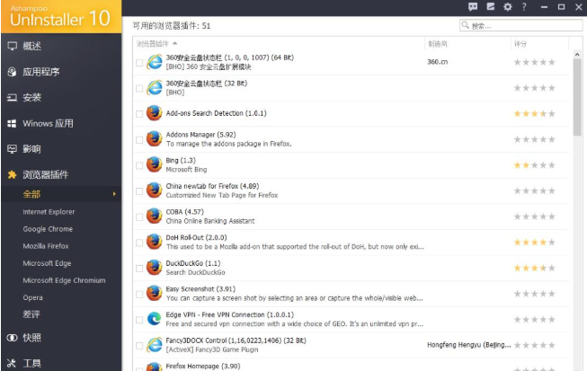 同理,Windows自带应用也可以通过阿香婆深度卸载。此外,你安装的浏览器插件也可检测出来,并进行管理。