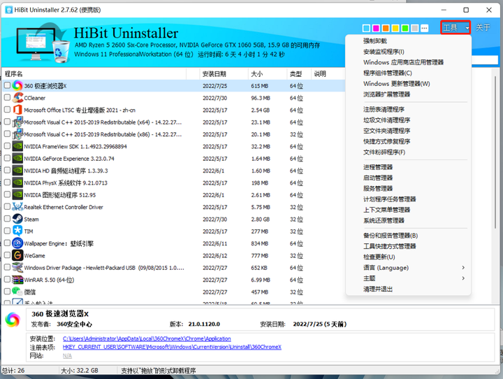 HiBit Uninstaller 是目前唯一一款原生单文件、便携、小体积、功能最全的软件卸载和系统优化工具!