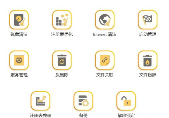 此外,它自带的一些小工具也让我大为震撼。11个简单却又很实用的功能:磁盘清理、启动项管理、反删除、文件粉碎、备份、文件关联、注册表整理、解除锁定等等