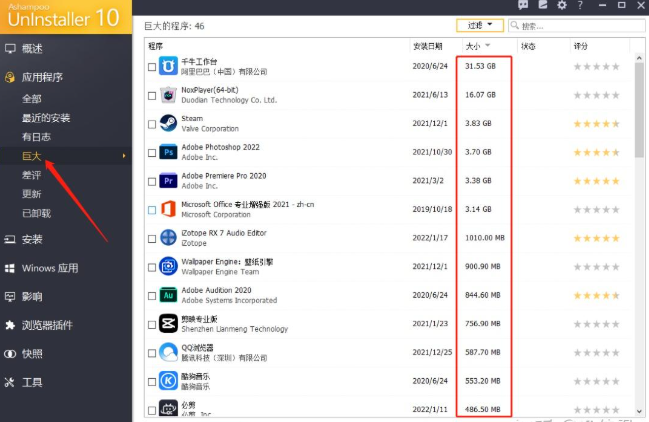 卸载软件的目的,是为了删除无用程序、解放磁盘空间。阿香婆菜单栏中的“巨大”选项,可以针对各应用的磁盘占用大小进行排序。什么软件占用空间大,一目了然!