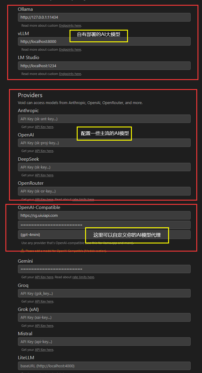 Void的能力不只局限于本地模型,它同样支持跟主流的云端和专有LLM提供商直接连接: