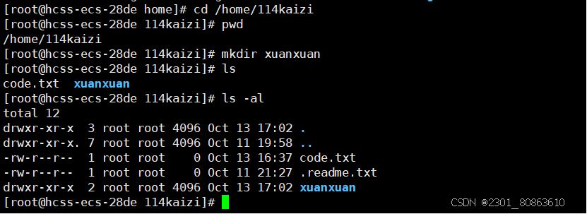 [root@hcss-ecs-28de 114kaizi]# 不管是创建文件还是创建目录的话,前面带一个.就成了隐藏文件了